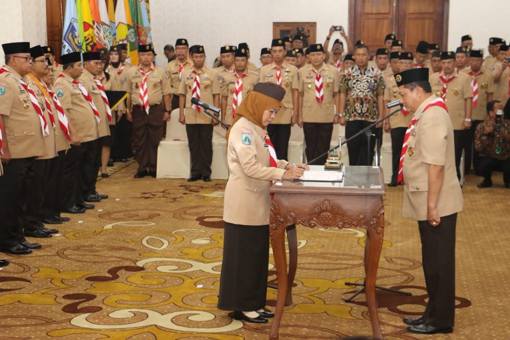 Surabaya, Nawacita – Ketua Kwartir Nasional (Kwarnas) Gerakan Pramuka Komjen Pol (Purn) Budi Waseso secara resmi melantik Gubernur Jawa Timur Khofifah Indar Parawansa sebagai Ketua Majelis Pembimbing Daerah (Mabida) Gerakan Pramuka Jatim Masa Bakti 2019-2024, di Gedung Negara Grahadi, Surabaya, Jumat (9/8).