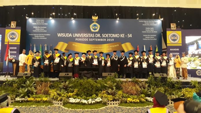 Surabaya, Nawacita – Kampus Kebangsaan dan Kerakyatan Universitas Dr. Soetomo ( Unitomo ) Sabtu (28/9) mewisuda 898 lulusan program D3, S1dan S2. Masing-masing dari Fakultas Ilmu Administrasi 74 orang, Fakultas Pertanian 25 orang, Fakultas Keguruan dan Ilmu Pendidikan 112 orang, Fakultas Ekonomi dan Bisnis 367 orang, Fakultas Teknik 64 orang, Fakultas Sastra 20 orang, Fakultas Sastra 20 orang, Fakultas Ilmu Komunikasi 86 orang, Fakultas Hukum 130 orang, dan Fakultas Ilmu Kesehatan 20 orang. Acara berlangsung di Convention Hall Grand City Surabaya dipimpin rektor, Dr. Bachrul Amiq, SH. MH.