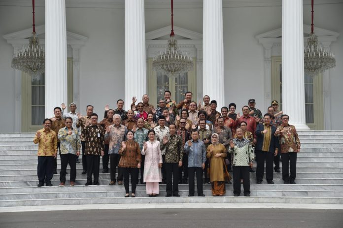 Para jajaran Kabinet Kerja juga berfoto bersama dengan Presiden Jokowi, Ibu Negara Iriana, Wakil Presiden Jusuf Kalla, serta Ibu Mufidah Jusuf Kalla di pelataran Istana Merdeka sebelum acara silaturahmi tersebut berlangsung. bdo