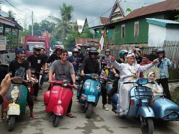 Jakarta, Nawacita – Biasanya pasangan pengantin naik mobil pengantin mewah usai acara pernikahan. Namun pasangan pengantin yang viral ini beda. Mereka memilih keliling naik vespa jadul.