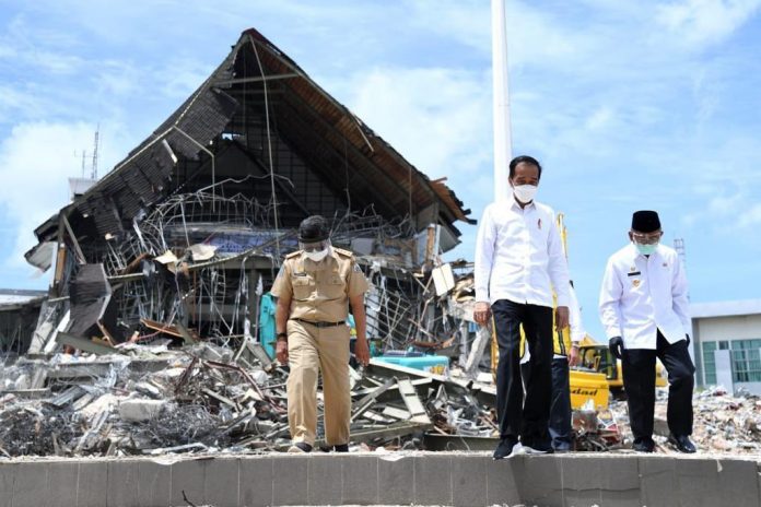 Didampingi Menteri Pekerjaan Umum dan Perumahan Rakyat (PUPR) Basuki Hadimuljono, Kepala Badan Nasional Penanggulanan Bencana (BNPB) Doni Monardo, dan Gubernur Sulawesi Barat Ali Baal Masdar, Presiden meninjau bangunan yang hancur akibat gempa magnitudo 6,2 yang mengguncang Kabupaten Mamuju dan Majene pada Jumat (15/1) lalu.