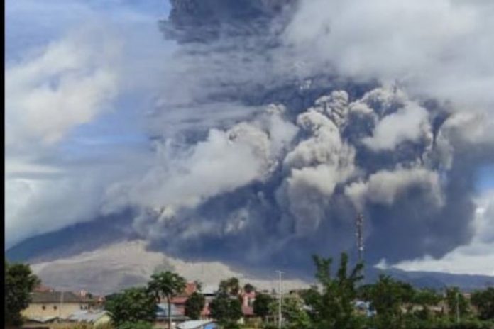 Nawacita – Abu vulkanik dari erupsi Gunung Sinabung kembali mengguyur beberapa kawasan di Kabupaten Tanah Karo, Sumatera Utara (Sumut), Kamis (21/7/2021).