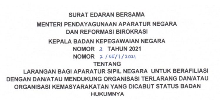 Penerbitan SE Bersama No. 02/2021 dan No. 2/SE/I/2021 yang ditandatangani pada 25 Januari 2021 ini dimaksudkan sebagai pedoman dan panduan bagi Pejabat Pembina Kepegawaian (PPK) mengenai larangan, pencegahan, serta tindakan terhadap ASN yang berafiliasi/mendukung organisasi terlarang atau ormas tanpa dasar hukum. Dalam SE tersebut terdapat ketentuan mengenai langkah-langkah pelarangan, pencegahan, penindakan, serta dasar hukum penjatuhan hukuman disiplin bagi ASN yang terlibat.