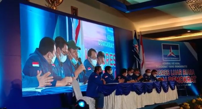 “Kongres Luas Biasa Partai Demokrat menimbang dan memperhatikan bahwa putusan menetapkan pertama, dari dua calon, atas voting bediri, maka Pak Moeldoko ditetapkan menjadi Ketua Umum Partai Demokrat periode 2021-2026,” ucap Jhoni.