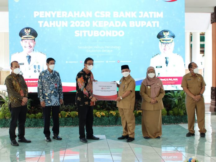Situbondo | Nawacita – Sebagai bentuk Tanggung Jawab Sosial Perusahaan kepada masyarakat, PT Bank Pembangunan Daerah Jawa Timur Tbk (bankjatim) menyerahkan bantuan Corporate Social Responsibility (CSR). Bantuan yang dikemas dengan label bankjatim peduli berupa Sarana dan Prasarana Pasar Rakyat & Kelompok Usaha Pengadaan.