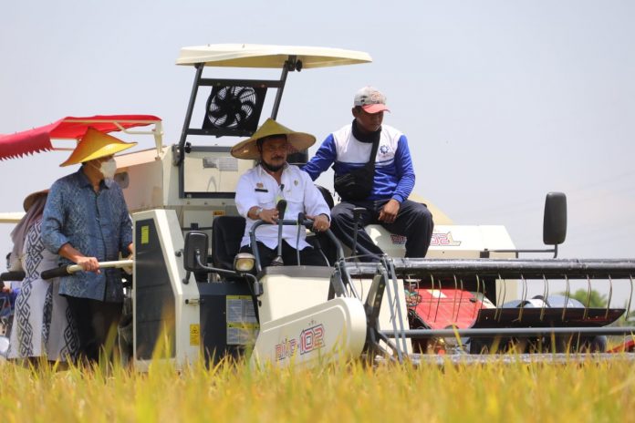 Gresik,- Menteri Pertanian, Syahrul Yasin Limpo melakukan panen raya padi di Desa Tambakrejo Kecamatan Duduk Sampean Kabupaten Gresik. Turut hadir pada panen tersebut yakni Menteri Perdagangan (Mendag) Muhammad Lutfi dan Menteri Badan Usaha Milik Negara (BUMN), Erick Thohir dan Gubernur Provinsi Jawa Timur, Khofifah Indra Parawansa.