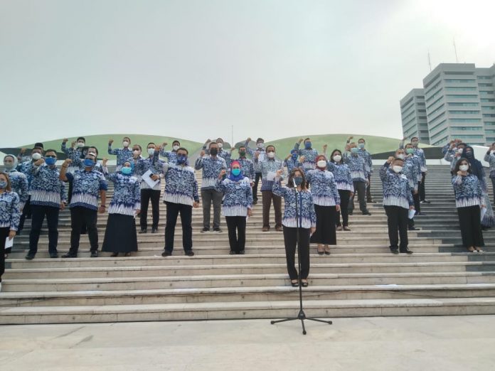 Pembacaan tersebut digelar di halaman Gedung Nusantara yang dikenal dengan gedung kura-kura, kompleks parlemen, Senayan, Jakarta, Senin (15/3/2021). Dengan nuansa baju seragam batik berwarna biru yang dikenakan para anggota fraksi.