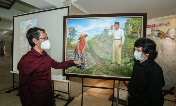 Surabaya, Nawacita – Lukisan yang menggambarkan pertemuan antara proklamator kemerdekaan Ir Sukarno (Bung Karno) dan petani bernama Marhaen diperkenalkan ke publik di kampus Universitas 17 Agustus 1945 (Untag) Surabaya, Selasa (6/4/2021). Lukisan karya pelukis Surabaya S. Pandji itu berdimensi 100 x 130 cm.
