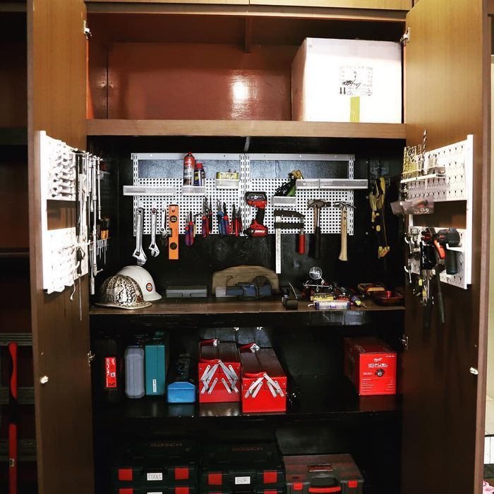 Masih dari unggahan di instagram pribadinya, Ariel juga membagikan potret sebuah lemari perkakas beserta perkakas lengkap di dalamnya.