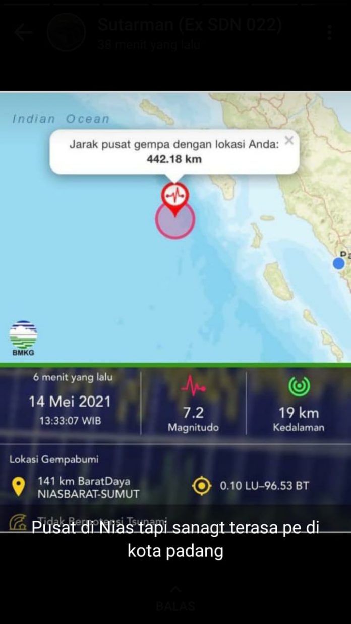 Pusat Pengendali dan Operasi (Pusdalops) Badan Nasional Penanggulangan Bencana (BNPB) telah menerima laporan dari 11 Badan Penanggulangan Bencana Daerah (BPBD) kabupaten/kota di 3 provinsi terkait gempabumi dengan parameter magnitudo 7.2 yang kemudian dimutakhirkan menjadi 6.7 di lepas pantai sebelah barat Kabupaten Nias Barat, Sumatera Utara, Jumat (14/5).
