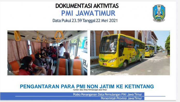 Berdasarkan data Dinas Perhubungan Jatim, per 22 Mei 2021, jumlah kedatangan PMI mencapai 9.944 orang dengan penambahan baru sebanyak 129 orang. Sehingga total yang masih dalam karantina sebanyak 947 orang dan 8.997 orang telah kembali ke daerah masing-masing.
