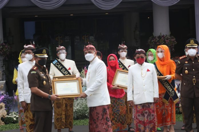 Disela – sela kegiatan resepsi dan upacara tersebut walikota Eri Cahyadi menyerahkan beberapa penghargaan kepada pihak – pihak yang berjasa dalam menekan infeksi serta penanggulangan covid – 19 didampingi Wakil Walikota Armuji dan FORPIMDA Surabaya.