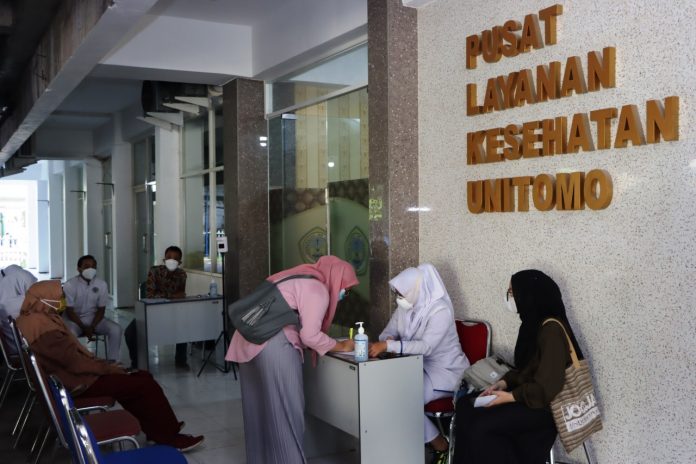 Surabaya, Nawacita – Fakultas Ilmu Kesehatan (Fikes) bersama Lembaga Penelitian dan Pengabdian Kepada Masyarakat Universitas Dr. Soetomo (LPPM Unitomo) menggelar Tes Rapid Antigen untuk peserta Kuliah Kerja Nyata (KKN). Bertempat di Pusat Layanan Kesehatan Gedung H lantai 1, secara bertahap sebanyak 200 peserta KKN dilakukan Rapid Antigen.