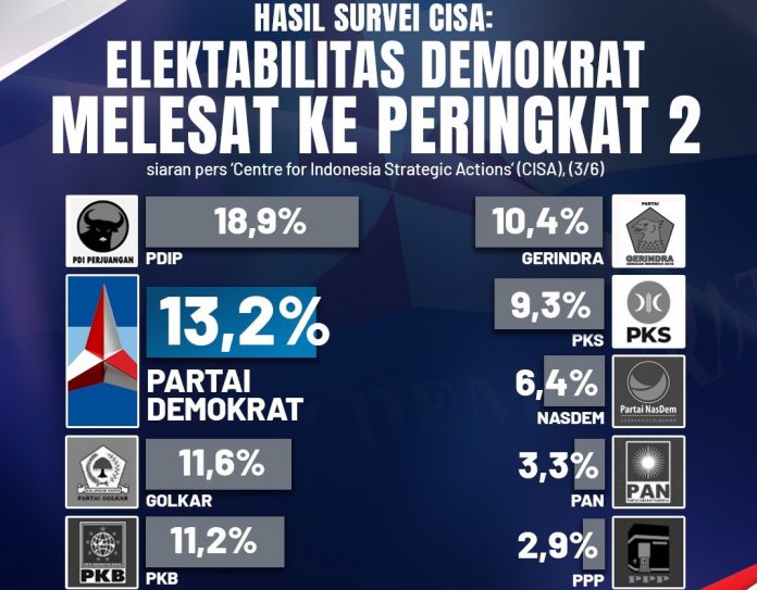 “PDI-Perjuangan cukup unggul elektabilitasnya dari parpol lainnya karena berhasil meraih 18,91 persen kemudian di posisi kedua ada Partai Demokat yang menunjukkan eskalasi keterpilihan di angka 13,22 persen yang disusul oleh Partai Golkar sebesar 11,65 persen serta Partai Kebangkitan Bangsa yang mendapatkan 11,20 persen,” jelas Herry.