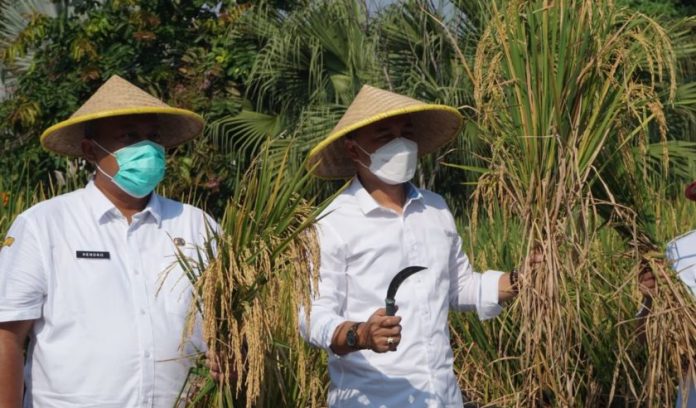 Surabaya, Nawacita – Eri Cahyadi Wali Kota Surabaya memanen 50 kilogram padi yang ditanam dengan metode urban farming di halaman Taman Surya, Balai Kota, Senin (9/6/2021).