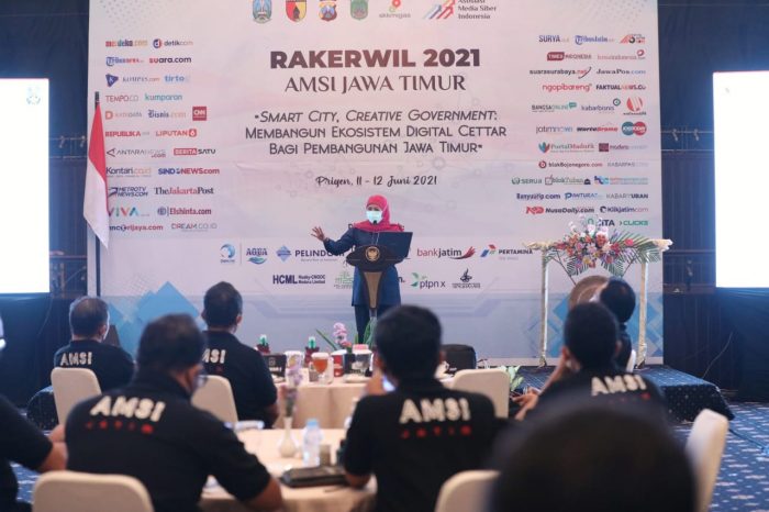 Malang, Nawacita 12 Juni 2021* – Bertajuk Seminar Nasional dan Rakerwil Asosiasi Media Siber Indoenesia (AMSI) Jawa Timur 2021, Gubernur Jawa Timur Khofifah Indar Parawansa membuka kegiatan yang mengambil tema ‘Smart City, Creative Government : Membangun Ekosistem Digital Cettar Bagi Pembangunan Jatim’, yang diselenggarakan di Royal Senyiur Hotel Pasuruan, Jumat (11/6) malam.