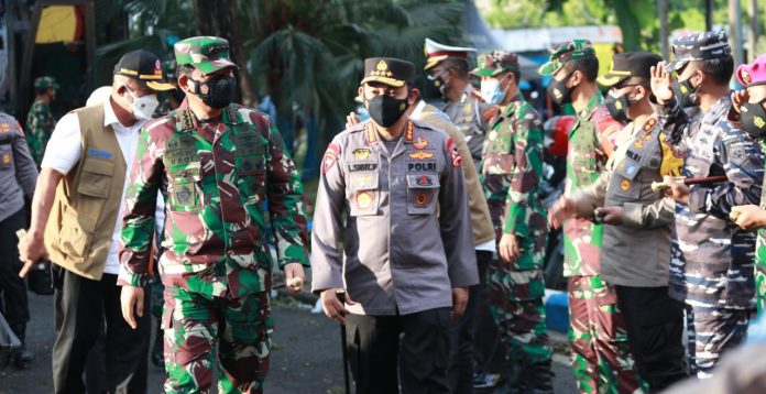 Panglima TNI Marsekal Hadi Tjahjanto, Kapolri Jenderal Polisi Listyo Sigit Prabowo, didampingi Forkopimda Jatim, Gubernur Jatim Khofifah Indar Parawansa, Pangdam V/Brawijaya Mayor Jenderal TNI Suharyanto dan Kapolda Jatim Irjen Pol Nico Afinta, serta Pejabat Utama Polda Jatim, meninjau serbuan vaksinasi di kabupaten Bangkalan.
