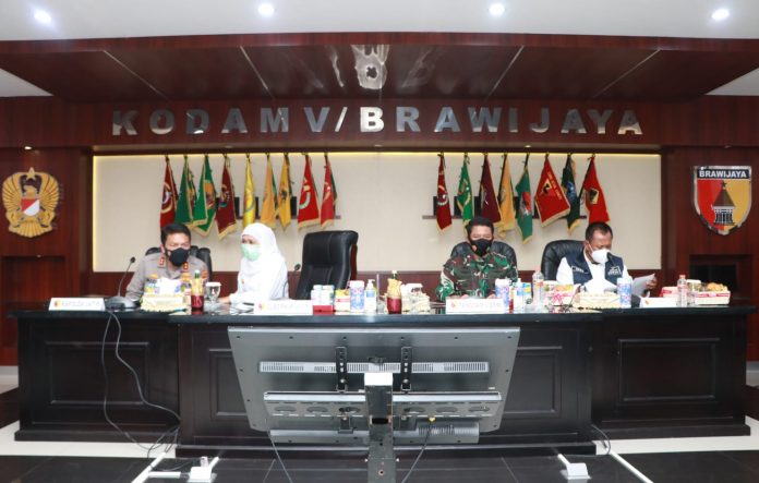 Surabaya, Nawacita – Forkopimda Jawa Timur, Gubernur Jatim Khofifah Indar Parawansa, Pangdam V Brawijaya Mayjen TNI Suharyanto, Kapolda Jawa Timur Irjen Pol Nico Afinta, Wali Kota Surabaya Eri Cahyadi dan Bupati Bangkalan R Abdul Latif Amin Imron serta stake holder terkait, Rabu (23/6/2021) malam menggelar Rapat Koordinasi Percepatan Penanganan Covid-19 di Kabupaten Bangkalan, yang dilaksanakan di Ruang Bina Yudha, Makodam V Brawijaya.