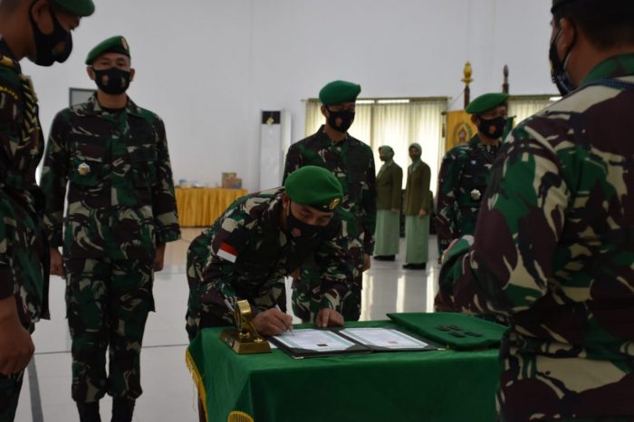 Surabaya, Nawacita – Serah terima jabatan Kepala Staf Korem 084/Bhaskara Jaya dari Brigjen TNI Handoko Nurseta kepada Kolonel Inf Erwin Rustiawan dan Dandim 0829/Bangkalan dari Letnan Kolonel Kav Ari Setyawan Wibowo kepada Letnan Kolonel Inf Syarifuddin Liwang berlangsung secara sederhana namun khidmat dan tidak melupakan protokol kesehatan, berlangsung di Aula Makorem 084/Bhaskara Jaya, Kamis (24/6/21).