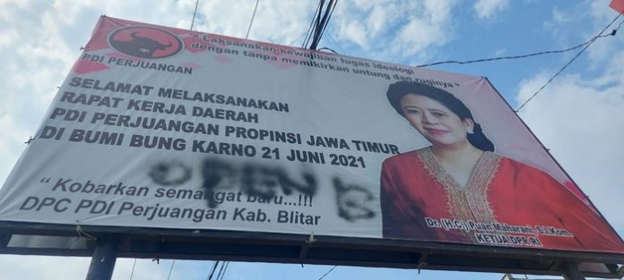 Blitar, Nawacita – DPP PDIP melaporkan aksi vandalisme di baliho Ketua DPR RI Puan Maharani. Tulisan dengan cat semprot ‘OPEN BO’ ditemukan di baliho yang terpasang di halaman kantor DPC PDIP di Jalan Raya Sambong Kanigoro, Kabupaten Blitar. Dalam baliho itu, Puan Maharani mengucapkan ‘Selamat melaksanakan Rapat Kerja Daerah PDIP Jawa Timur. Di Bumi Bung Karno 21 Juni 2021.