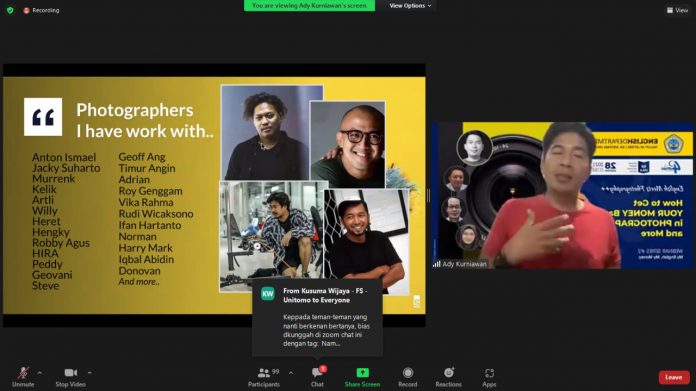 Webinar bertajuk “How to Get YOUR MONEY Back in PHOTOGRAPHY and More”ini, dinarasumberi oleh Ady Kurniawan, alumni prodi sastra Inggris Unitomo yang berprofesi sebagai Produser Fotografi Komersial.