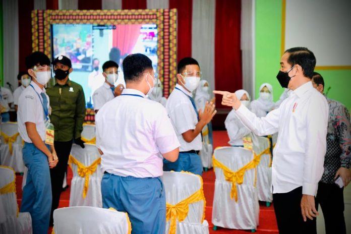 Bandar Lampung | Nawacita – Presiden Joko Widodo menyapa masyarakat yang menjadi peserta vaksinasi Covid-19 di beberapa wilayah di Provinsi Lampung melalui konferensi video, saat meninjau kegiatan vaksinasi di SMA Negeri 2 Kota Bandar Lampung, pada Kamis, 2 September 2021.