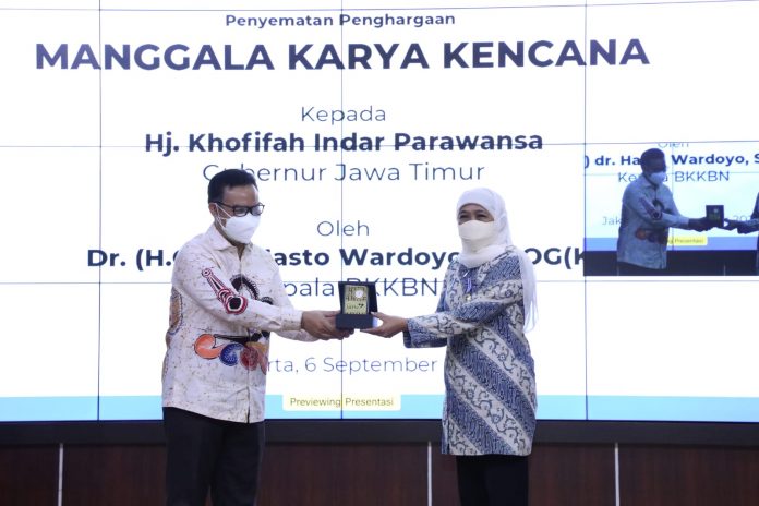JAKARTA, Nawacita – 6 SEPTEMBER 2021 – Sebagai bentuk apresiasi atas kepedulian dan dukungannya terhadap kemajuan program Keluarga Berencana (KB) dan kesejahteraan keluarga di Jatim, Gubernur Jawa Timur Khofifah Indar Parawansa mendapatkan Tanda Penghargaan Manggala Karya Kencana (MKK) Tahun 2021 dari Badan Kependudukan dan Keluarga Berencana (BKKBN) RI.