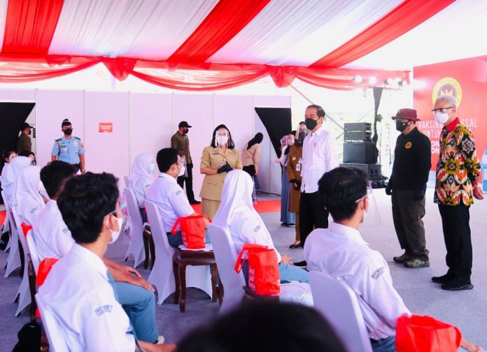 Hal tersebut diungkapkan Presiden Jokowi saat meninjau kegiatan vaksinasi bagi pelajar SMA sederajat se-Kabupaten Sukoharjo yang digelar di SMA Negeri 1 Kartasura, Kabupaten Sukoharjo, pada Senin, 13 September 2021. Presiden yang didampingi Ibu Iriana Joko Widodo juga menyapa para peserta vaksinasi pelajar dari sejumlah lokasi lainnya di seluruh Indonesia melalui konferensi video.