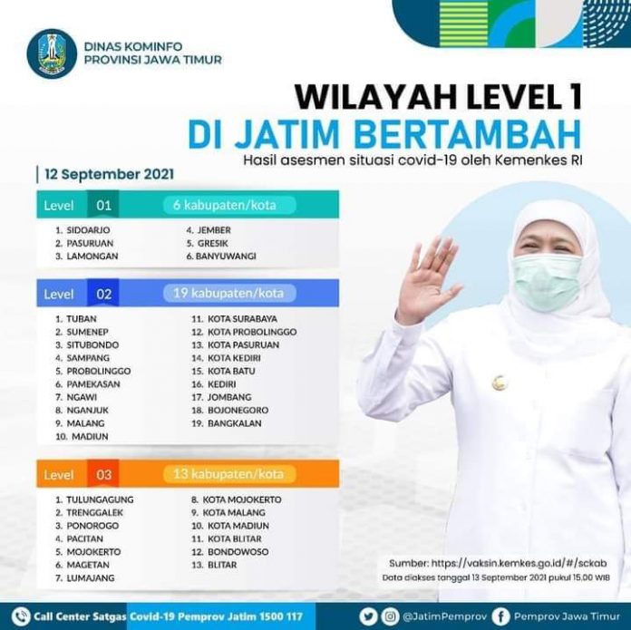 Berdasarkan assesment situasi Covid-19 dari Kemenkes RI, per 12 September 2021 yang dirilis pada 13 September 2021, 6 kabupaten/kota di Jawa Timur masuk pada level 1 yaitu  Kab. Lamongan, Jember, Pasuruan, Gresik, Sidoarjo, dan Banyuwangi. Kondisi ini mengalami peningkatan dibandingkan sebelumnya dalam assesment yang dilakukan oleh Kemenkes RI per 9 September 2021 dari 3 kabupaten menjadi 6 kabupaten.