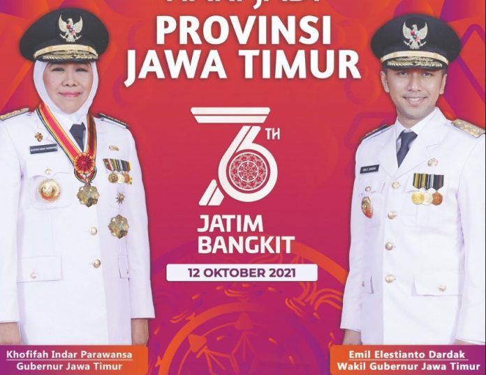 Surabaya, Nawacita – (12 Oktober 2021)* – Provinsi Jawa Timur berulang tahun yang ke-76 pada 12 Oktober hari ini. Gubernur Jawa Timur, Khofifah Indar Parawansa optimistis, provinsi yang akan dipimpinnya akan bangkit dari Pandemi Covid 19 dan ekonomi segera pulih. Khofifah juga yakin Jawa Timur dapat terus menginspirasi, serta menjadi teladan dan panutan terutama dalam membangun hidup guyub rukun bagi daerah-daerah lain di Indonesia.