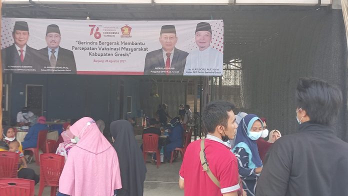 Gresik, Nawacita – ketua Pimpinan Anak Cabang ( PAC) dari Partai Gerindra Kecamatan Benjeng Sadeli Rosyid, bersama Abdullah Munir selaku Anggota DPRD dari Partai Gerindra kabupaten Gresik, bekerja sama dengan Dinas kesehatan kabupaten Gresik, melaksanakan kegiatan vaksinasi dosis II Sinovac maupun AstraZeneca, di desa Kedung Rukem Benjeng, Kabupaten Gresik, Kamis, 14 Oktober 2021.