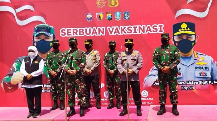 Surabaya, Nawacita – Panglima TNI Marsekal Hadi Tjahjanto didampingi Kapolri Jenderal Polisi Listyo Sigit Prabowo, dan Kasal Laksamana TNI Yudo Margono pada Jumat (15/10/2021) berkunjung ke Surabaya untuk memantau pelaksanaan vaksinasi Covid-19.