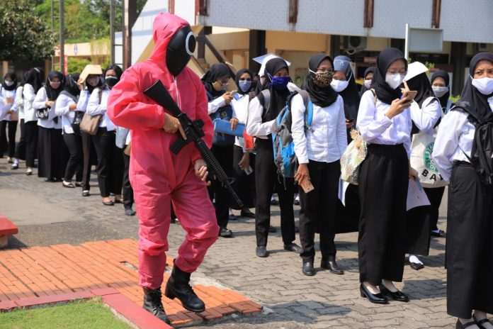 Surabaya, Nawacita – Kanwil Kemenkumham Jatim punya cara unik untuk mencairkan ketegangan dalam Seleksi Kompetensi Dasar (SKD) CPNS Formasi Penjaga Tahanan dan Pemeriksa Keimigrasian. Hari ini (20/10) para peserta dihibur dengan panitia yang berdandan ala pink soldier dalam film seri Squid Game.