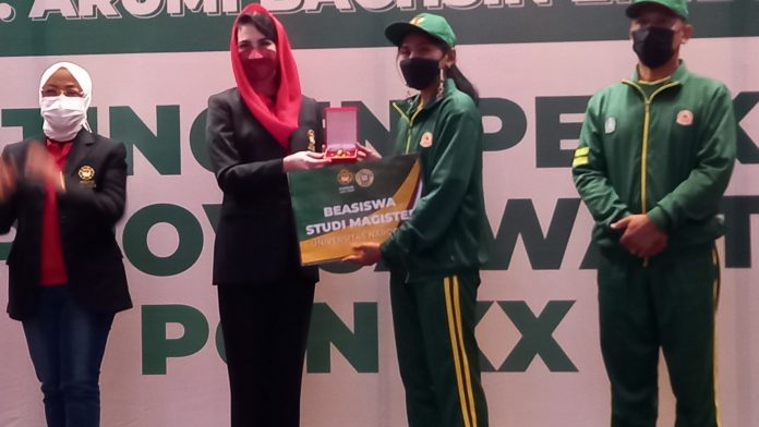 SURABAYA – 30Â Oktober 2021 – Ketua Persatuan Wanita Olahraga Indonesia (Perwosi) Jatim Arumi Bachsin Emil Elestianto Dardak memberikan penghargaan kepada atlet Shorinji Kempo Jatim, Marta Frily Adetya. Penghargaan tersebut diberikan kepada Marta Frily Adetya karena mampu menyumbangkan medali perak di ajang Pekan Olahraga Nasional (PON) XX/2021 Papua.