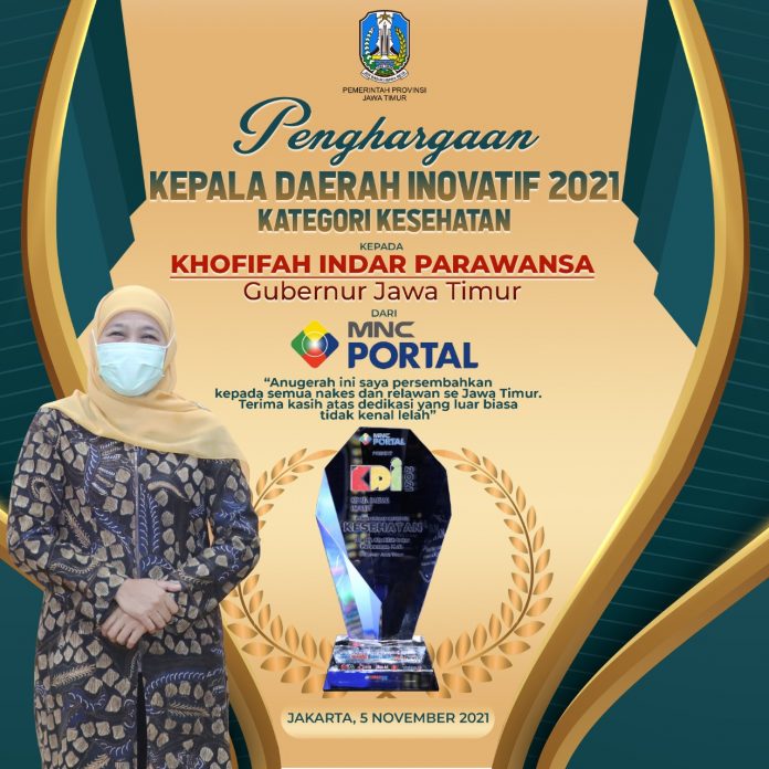 Jakarta, Nawacita – 6 November 2021* Gubernur Jawa Timur Khofifah Indar Parawansa meraih penghargaan sebagai Kepala Daerah Inovatif (KDI) 2021 Kategori Kesehatan dari MNC PORTAL yang disekenggarakan di MNC Conference Hall iNews Tower, Jumat (5/11) malam.