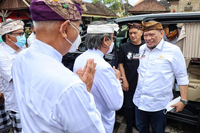 Tabanan, Nawacita – Ketua DPD RI, AA LaNyalla Mahmud Mattalitti, menyerap sejumlah aspirasi dari pelaku pariwisata, pertanian dan UMKM saat melakukan kunjungan ke Puri Agung Tabanan, Bali, Sabtu (6/11/2021). Acara tersebut difasilitasi Badan Promosi Pariwisata Daerah (BPPD) Kabupaten Tabanan.