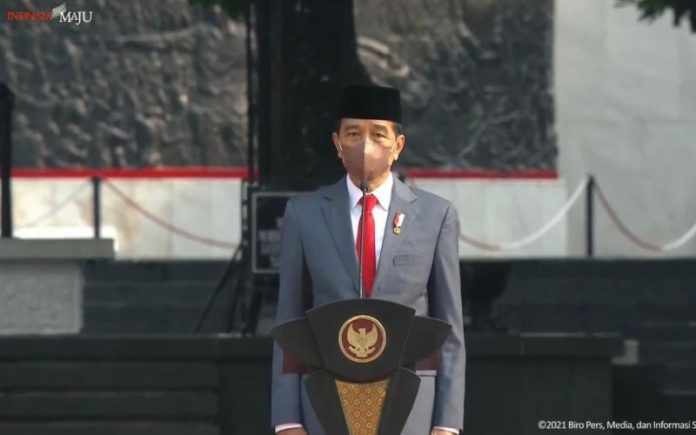 Jakarta, Nawacita – Presiden Joko Widodo (Jokowi) memimpin upacara ziarah nasional untuk memperingati hari pahlawan nasional tahun 2021 di Taman Makam Pahlawan (TMP) Kalibata, Jakarta, Rabu (10/11). Upacara digelar pada pukul 08.11 WIB dan dihadiri oleh sejumlah pejabat negara.