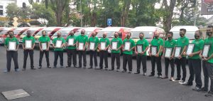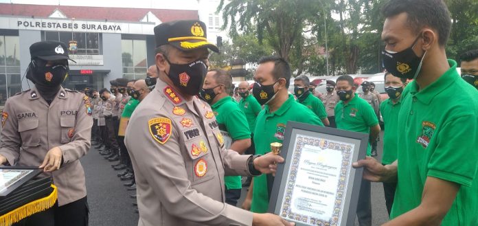 Pada hari ini kami dari Polrestabes Surabaya khususnya mewakili daripada Bapak Walikota dan Forkopinda serta masyarakat kota Surabaya menyampaikan penghargaan setinggi-tingginya dan ucapan terima kasih kepada para relawan operator mobil gerai vaksin keliling yang diawakili oleh 22 orang yang saat ini.