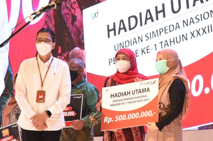 Sementara itu, dalam kesempatan tersebut Khofifah memberikan secara simbolis hadiah undian Simpeda nasional Rp 500 juta kepada 2 nasabah dan Simpeda regional Rp 100 juta kepada 5 nasabah. Kedua nasabah pemenang undian Simpeda nasional Rp 500 juta itu adalah Abdul Ghofur yang merupakan nasabah dari Cabang Nganjuk dan Rian Twi Narsih yang merupakan nasabah dari Cabang Mojokerto.