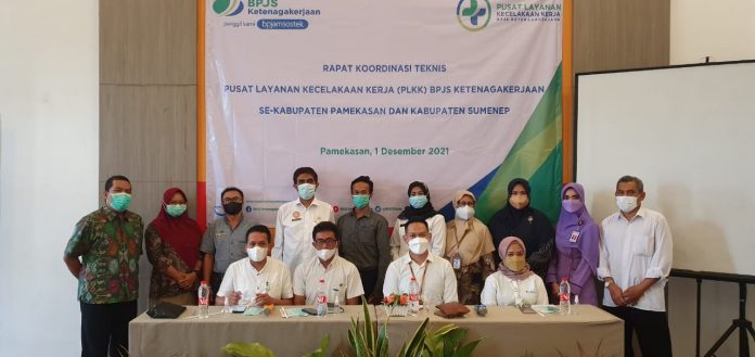 PAMEKASAN, Nawacita – BPJS Ketenagakerjaan (BPJAMSOSTEK) Cabang Pamekasan menggelar Rapat Koordinasi Teknis (Rakornis) Pusat Layanan Kecelakaan Kerja (PLKK) Se-Kabupaten Pamekasan dan Sumenep di Pamekasan, Rabu (1/12/2021). Kegiatan ini diharapkan dapat meningkatkan sinergitas dan kualitas penanganan kasus kecelakaan dan Penyakit Akibat Kerja (PAK).