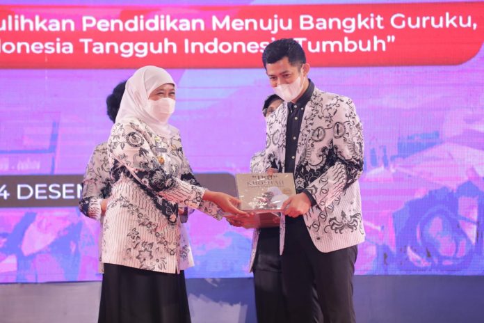 Surabaya, Nawacita- – (4 Desember 2021) – Gubernur Jawa Timur Khofifah Indar Parawansa menerima anugerah Dwija Praja Nugraha dari Pengurus Besar Persatuan Guru Republik Indonesia (PGRI). Anugerah ini merupakan penghargaan tertinggi yang diberikan kepada Kepala Daerah yang dianggap memiliki perhatian dan komitmen luar biasa pada dunia pendidikan, guru dan PGRI.