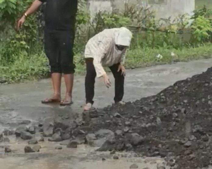 Dari pantauan nawacita.co di lapangan, Meskipun diguyur hujan lebat, Risma tetap membantu menutupi jalan yang berlubang dengan kerikil-kerikil batu.