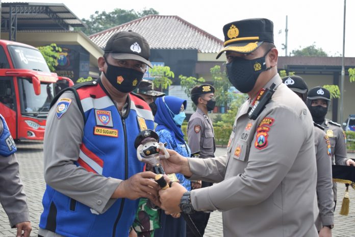 Sidoarjo, Nawacita – Kapolresta Sidoarjo Kombes Pol. Kusumo Wahyu Bintoro memberikan penghargaan kepada 119 anggotanya dan polsek jajaran berprestasi, serta satu babinsa Koramil Sidoarjo dan Lurah Pucang, Sidoarjo, yang turut membantu tugas kepolisian dalam penanggulangan Covid-19.