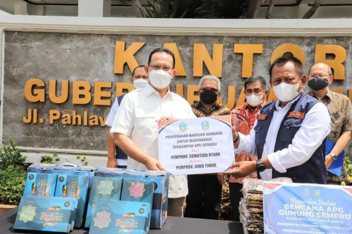 Surabaya, Nawacita – Pemerintah Provinsi Jawa Timur kembali menerima bantuan kemanusiaan untuk penanganan bencana awan panas guguran (APG) Gunung Semeru di Kab. Lumajang. Kali ini, bantuan berupa keperluan sandang dan perlengkapan sholat dari jajaran Pemprov Sumatera Utara (Sumut) tersebut diterima secara simbolis oleh Plh. Sekretaris Daerah Prov. Jatim Heru Tjahjono dari Pj. Sekdaprov Sumut H. Afifi Lubis di Lobby Kantor Gubernur Jatim, Jl. Pahlawan No. 110 Surabaya, Jumat (17/12) siang.