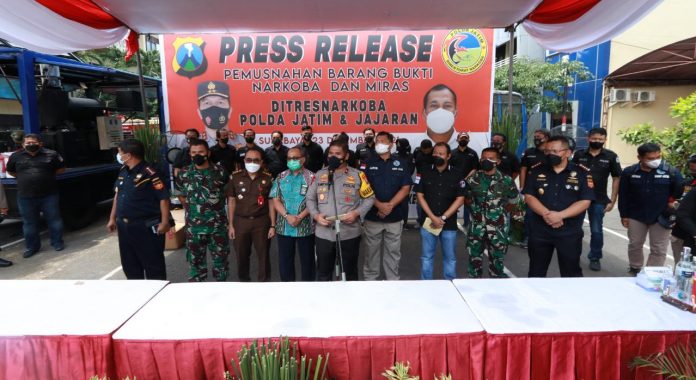 Surabaya, Nawacita – Polda Jawa Timur bersama Badan Narkotika Nasional Provinsi (BNNP) Jawa Timur, serta stakeholder, tokoh agama dan tokoh masyarakat di Jawa Timur, jelang perayaan Natal dan tahun baru (Nataru), melakukan pemusnahkan barang bukti Narkoba dan Minuman Keras (Miras) di depan parkir PJR Mapolda Jawa Timur, Kamis (23/12/2021) siang. Pemusnahan ini sebagai realisasi tugas Polri dalam pengungkapan kasus narkoba.