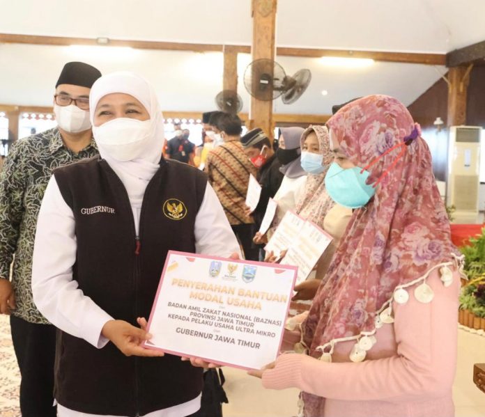 Penyerahan bantuan ‘Zakat Produktif’ yang dikucurkan dari Badan Amil Zakat (Baznas) Prov. Jatim itu sendiri diberikan kepada masing-masing penerima senilai Rp.500 ribu dan sembako kepada 50 pedagang pasar tradisional dan Ultra mikro.