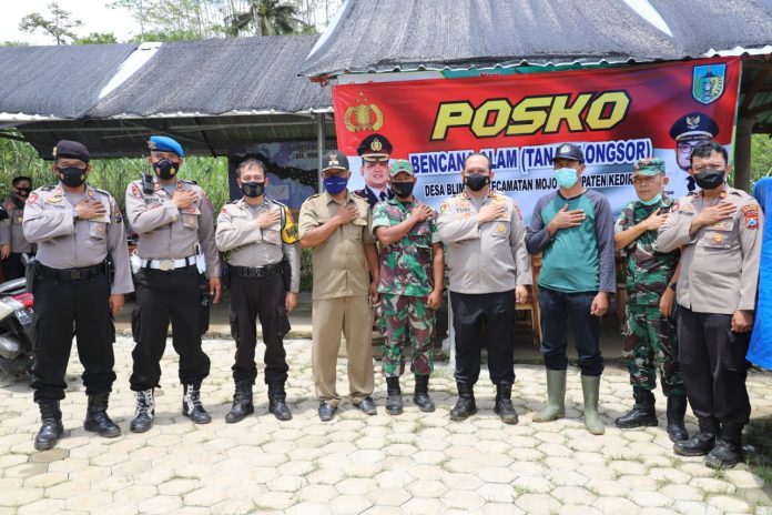 Surabaya, Nawacita- Pasca banjir dan tanah longsor yang menerjang Desa Blimbing Kecamatan Mojo Kabupaten Kediri, Minggu 2 Januari 2022, Kapolres Kediri Kota AKBP Wahyudi S.I.K., M.H meninjau langsung lokasi bencana.