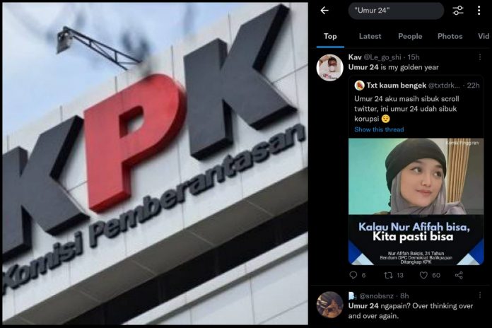 “Umur 24 aku masih sibuk scroll twiter, ini umur 24 udah sibuk korupsi 😌,” cuitan @txtdrkaumbengek membuka perbincangan netizen Twitter sambil mengunggah poster bergambar foto Nur Afifah dengan caption Kalau Nur Afifah bisa, Kita pasti bisa, dilansir dari Twitter, Selasa (18/1/2022) malam.