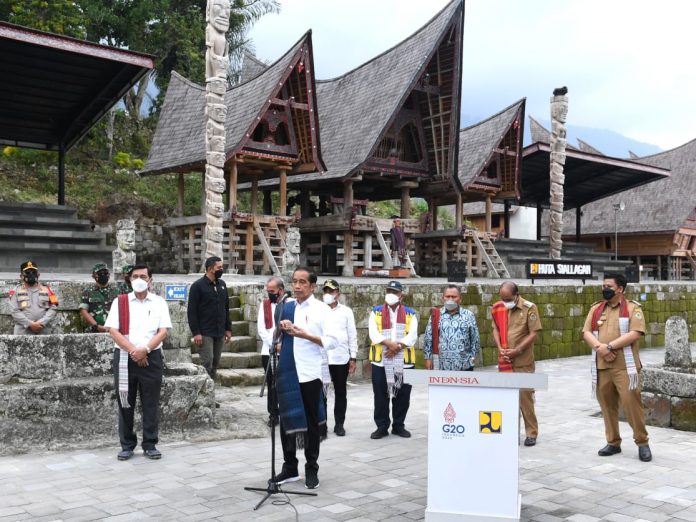 “Jadi di kawasan Huta Siallagan ini dulunya di sekitar, di sekelilingnya adalah penuh, padat dengan rumah-rumah modern,” ungkap Presiden.