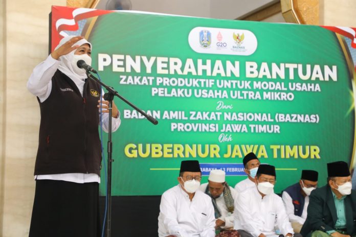 Sementara itu, dalam acara penyaluran zakat produktif, sedikitnya 150 orang pelaku usaha ultra mikro menerima zakat produktif masing- masing 500 ribu rupiah dari BAZNAS Jatim yang diserahkan Gubernur Khofifah. Khofifah juga memberikan bantuan sembako kepada para lansia dan para dhu’afak.